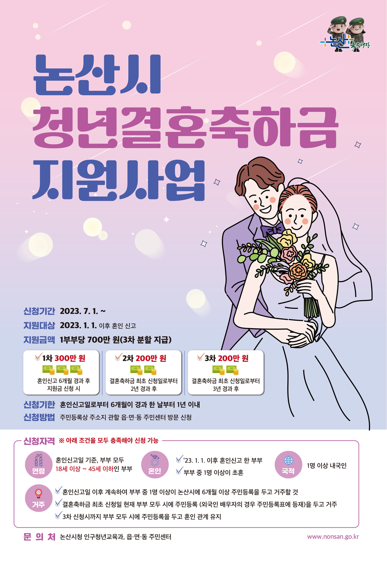 - 대상: 2023년 1월 1일 이후 혼인신고 후 부부 1명 이상 논산시에 6개월 이상 거주 중인 만 18세~45세 신혼부부