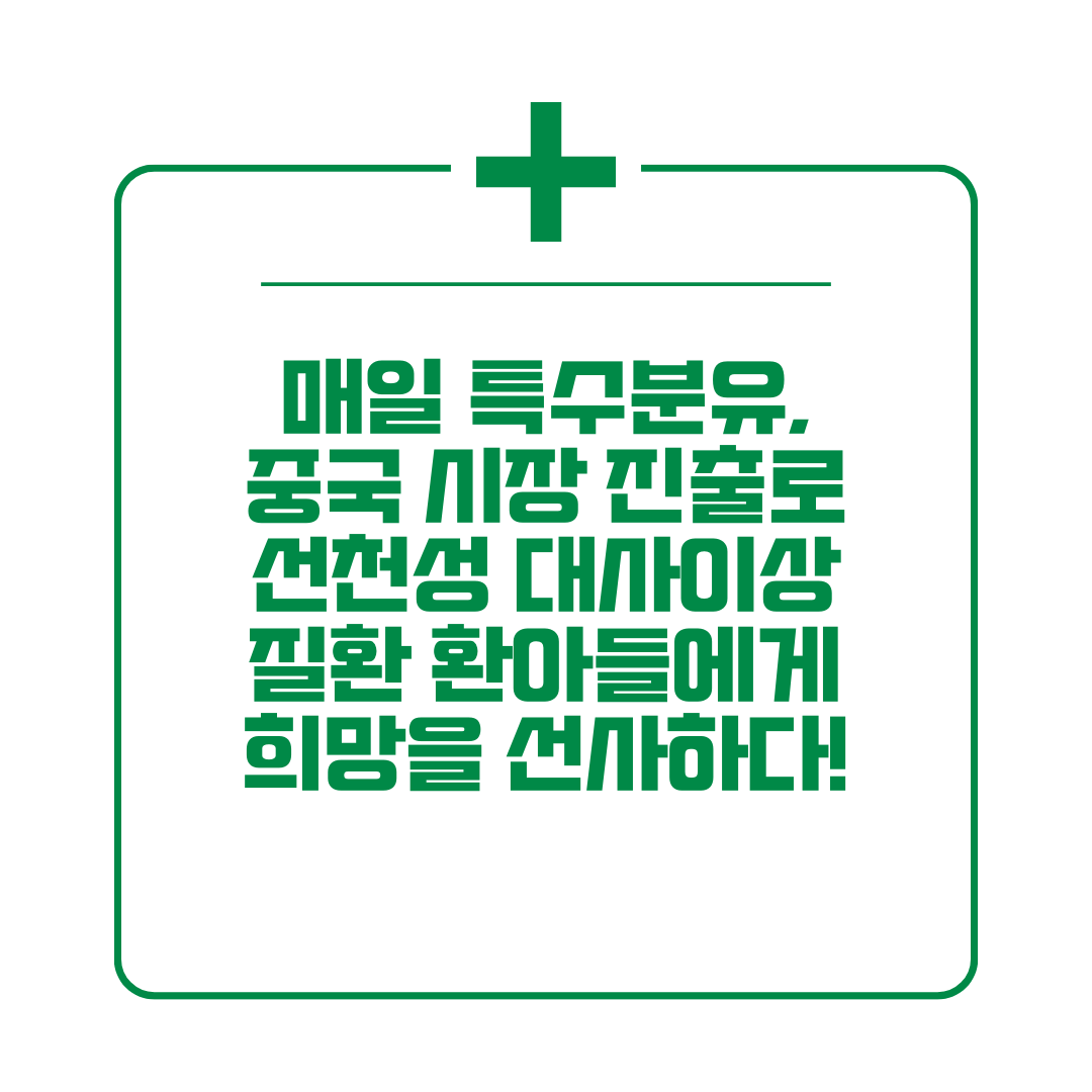 • 중국 환아들에게 희망: 한국산 특수분유는 중국 시장 진출을 통해 더 많은 환아들에게 안전하고 효과적인 치료 기회를 제공할 수 있을 것입니다.
