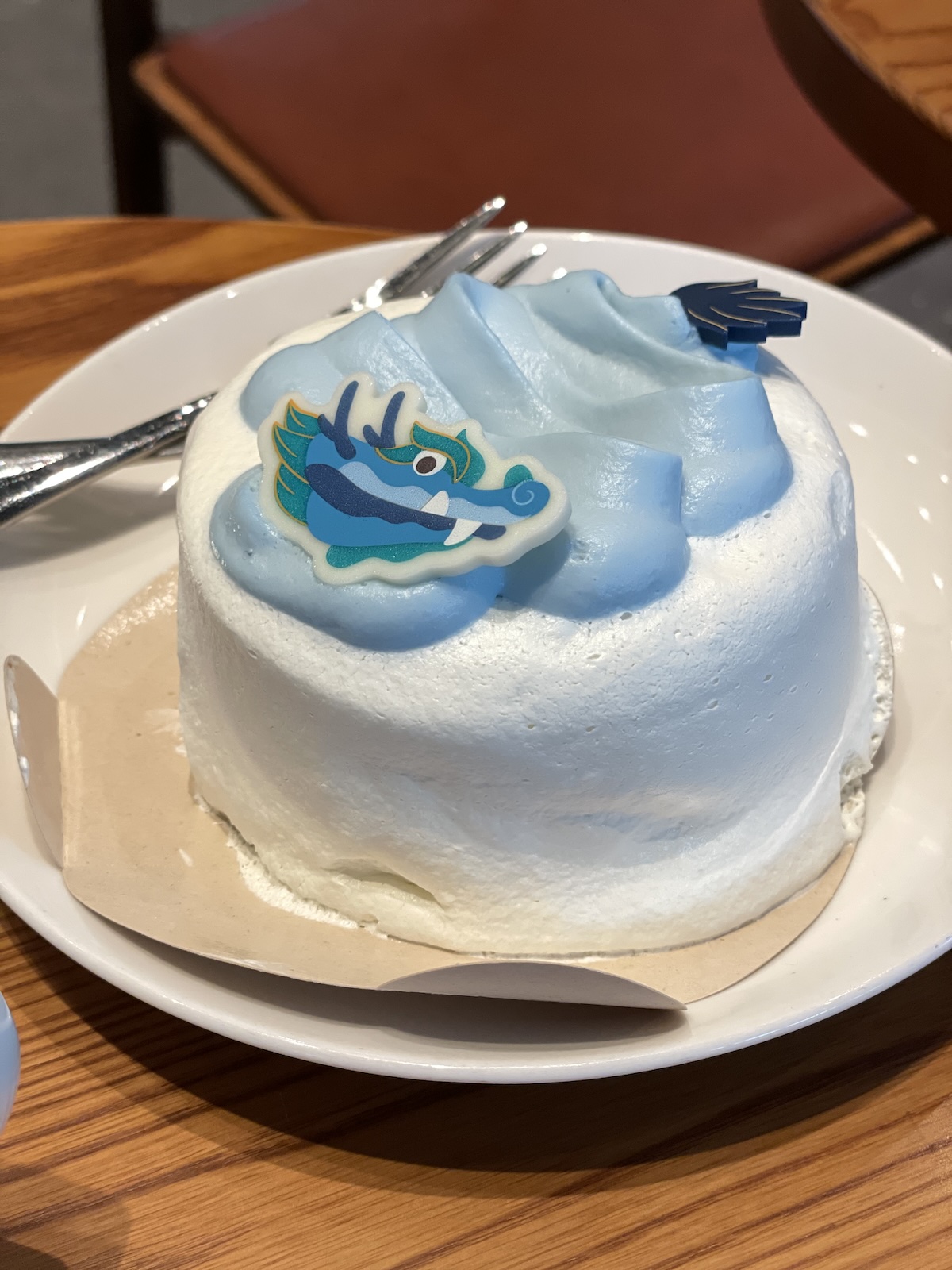 케이크는 푸른 용 블루베리 수플레 케이크와 함께 나왔는데, 외관부터 이미 눈에 띄게 아름다운 푸른 용의 색이 돋보입니다. 쉬폰 케이크의 부드러움이 입안에서 향긋한 맛을 선사해줬어요. 다만, 크림이 케이크에 비해 조금 많은 편이라 느끼함이 있었지만, 그래도 전체적으로 만족스러웠습니다.