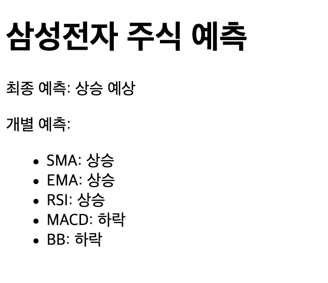 각각의 기술적 지표는 독립적으로 주식의 움직임을 예측합니다. 따라서, 프로그램의 중요한 부분은 이러한 지표들의 결과를 결합하여 최종 예측을 도출하는 것이었습니다.