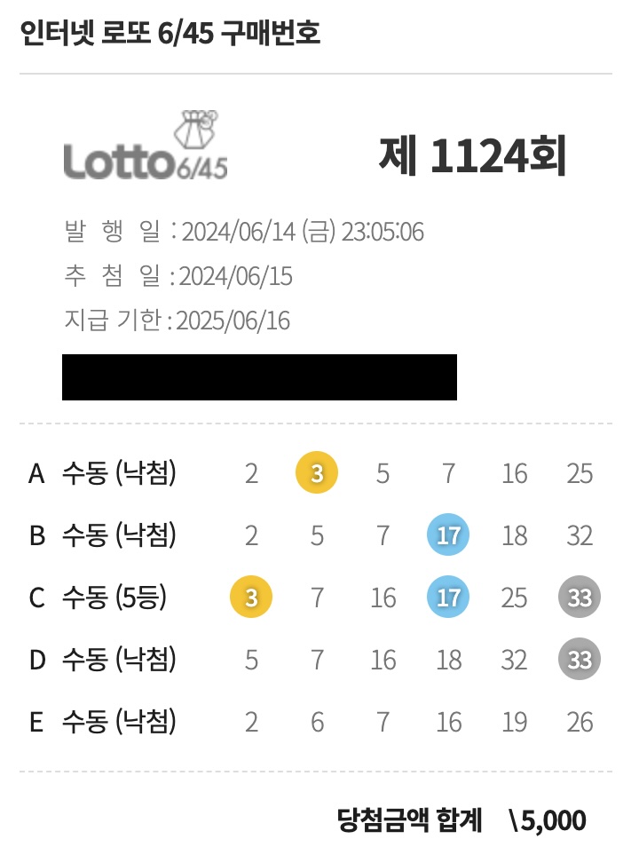 알고리즘을 공개한 후, 최근 1124회차 로또에서 5등에 당첨되는 기쁨을 맛보았습니다. 5등이지만, 단 3개의 번호를 맞추는 것도 쉽지 않은 일이기 때문에 이는 우리 알고리즘의 효과를 입증하는 작은 성과라고 할 수 있습니다.